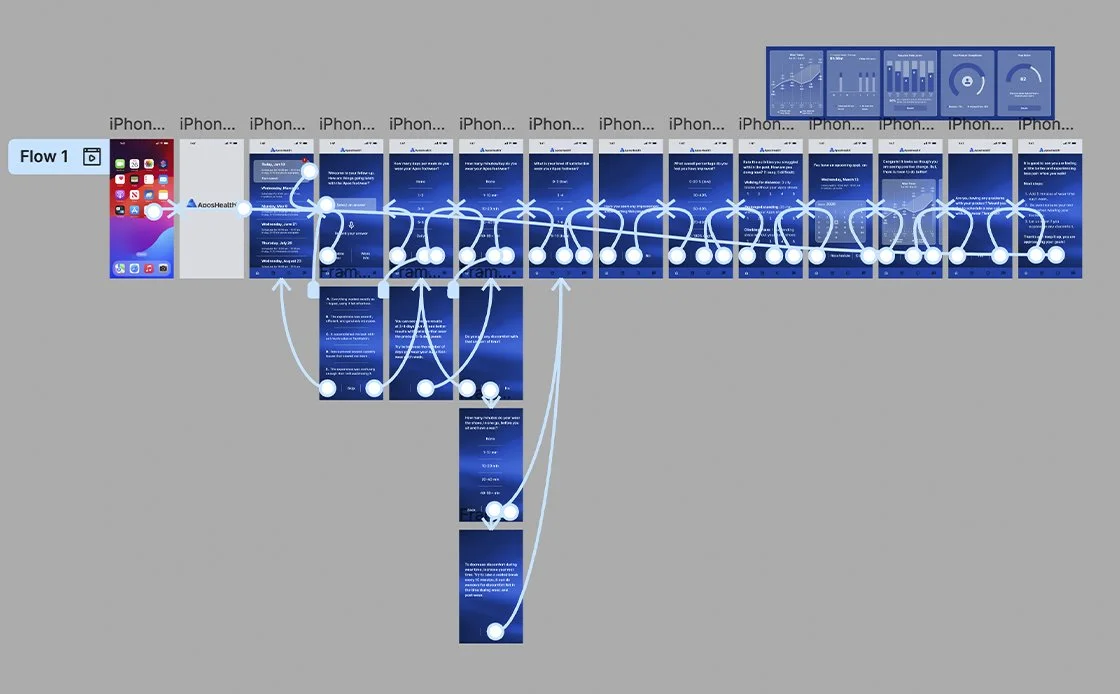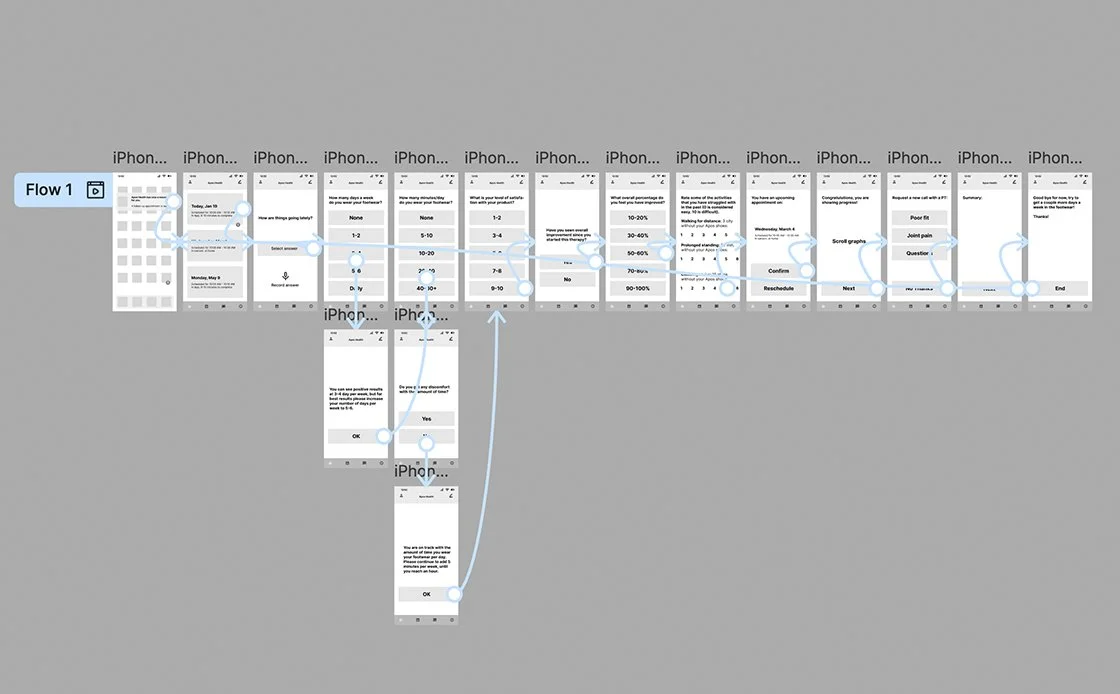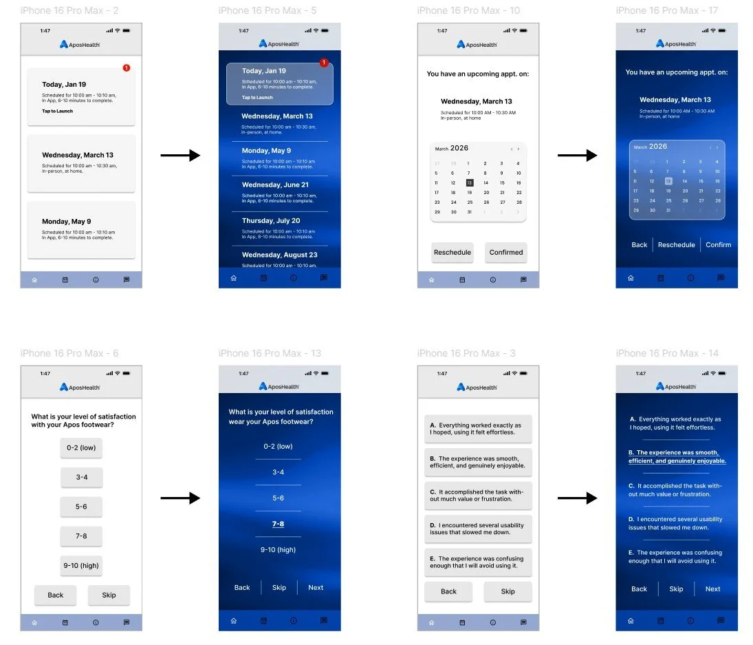Based on user research, three features were prioritized for early digital wireframe exploration: 1) Flexible scheduling, allowing patients to choose when to complete follow-up appointments; 2) Data visualization, designed to motivate patients by showing their progress; and 3) Point-of-care education and monitoring.