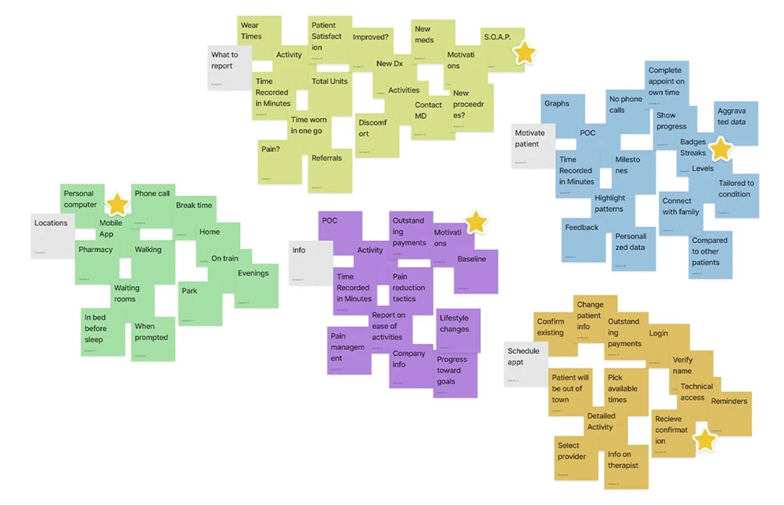 Affinity mapping was used to organize research data into key themes, enabling clearer pattern recognition and identification of user needs. These insights guided design decisions and ensured user-centered solutions, surfacing critical themes such as patient engagement, progression, re-engagement, phone scam anxiety, and respect for patients’ time.