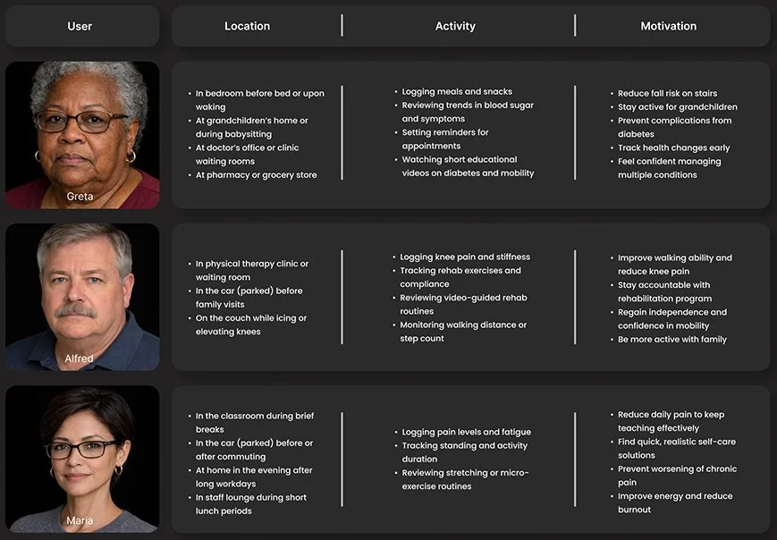 To better understand how and where patients would use the app, we analyzed users, locations, activities, and motivations in greater depth. The resulting user matrix helped identify key patterns and priorities, guiding design decisions and ensuring features were grounded in real-world patient contexts.