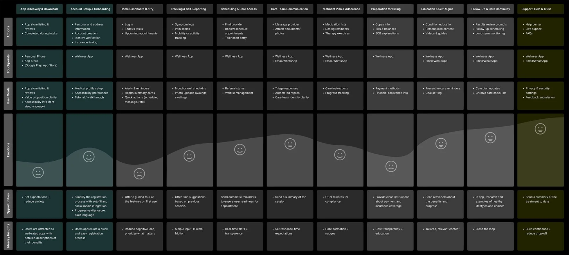 This journey map captures key user interactions across segments, highlighting touchpoints, emotions, and pain points. These insights guided design priorities and helped shape solutions to reduce friction at critical moments.