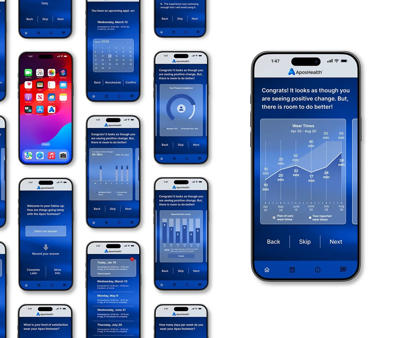 Research surfaced key innovation opportunities, including patient-focused visual data, on-the-go appointment management, dynamic scheduling, and wear-time advice. These insights guided improvements to navigation and patient engagement. The selected framework prioritized simplicity and ease of use, ensuring a more efficient and user-friendly product experience.